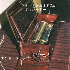 シリンダー・オルゴールのゼンマイを巻上げる最も古い方式では、写真1のようにエンドフラップを開けて、ディバイダーに収められているキーをゼンマイから延びている四角い軸に差し込んで行います。写真2の様なフレンチ・クロックキーや、T型のハンドル、クランク型のハンドルも作られていました。巻上げがキーからレバーに代わったのは1860年頃で、それまでは音量が小さくソフトな音が好まれていました。それ以降は徐々に商業主義に毒されていき、大きな音量、最小限の櫛歯で最大限の効果、鐘や太鼓、カスタネット、チターの追加、曲数の増加とツーパーターンが作られて行きました。オルゴールの純粋な音を楽しもうとするコレクターにとっては「キーワインド」はとても魅力です。