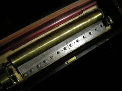 普通のオルゴールよりも長いシリンダーと2枚の櫛歯、そして沢山のコーム・スクリューに注目してください。