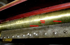 マンドリン・オルゴールは短い間隔で隣り合った歯を弾いていくので、シリンダーに植え込まれたたくさんののパターンが緩い右上がり又は右下がりの直線状(特に高音部に顕著です)に並んでいるのが、写真2の赤い線のように見えます。櫛歯の総数も一般のオルゴールの櫛歯と比較して多く(この個体は202本5曲)、櫛歯の歯も細く間隔が狭くなっています。長いシリンダー(直径2インチ=5cm、長さ17インチ=44cm)と櫛歯を収容するために、ケースのプロポーションも細長くなっています。